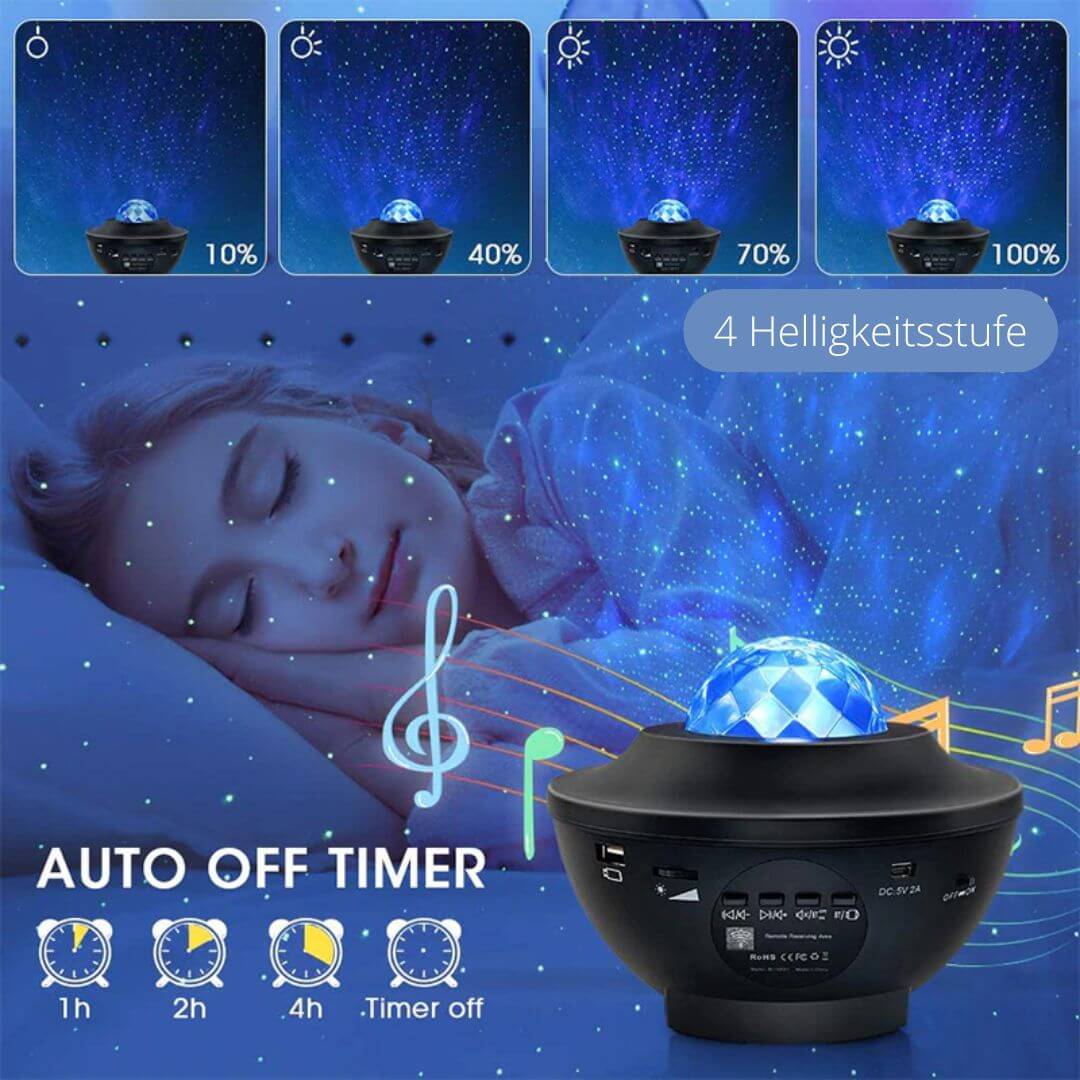 Auch für die Kleinsten ist der Projektor ein Segen. Als beruhigendes Nachtlicht vertreibt er die Angst vor der Dunkelheit und lädt zu süßen Träumen unter einem magischen Sternenhimmel ein. So sorgt er für ruhige Nächte – bei Kindern und Eltern.