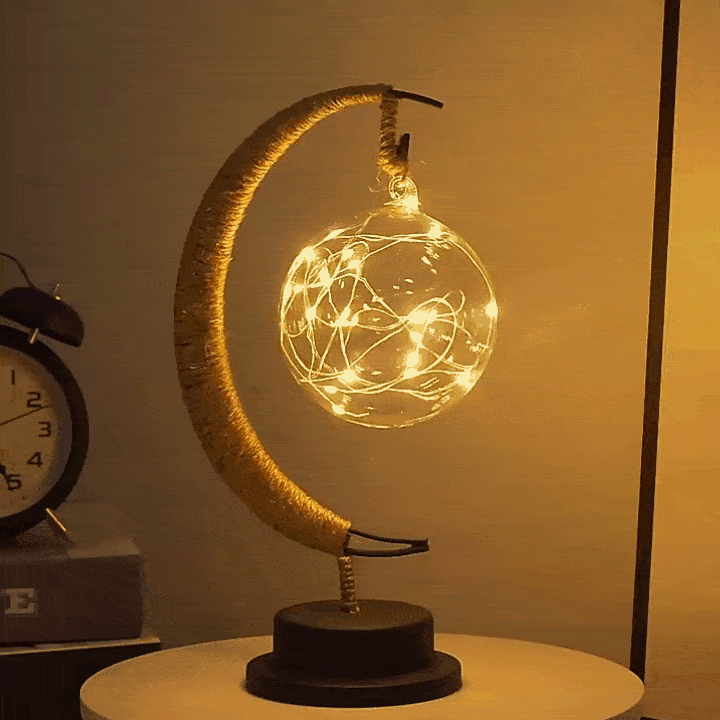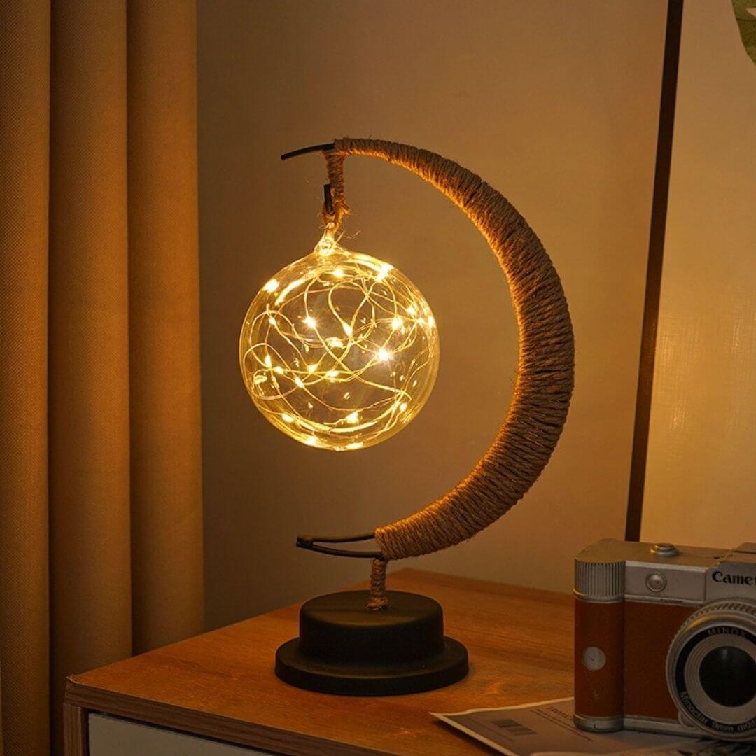 Erlebe die zauberhafte Verbindung von klarem Design und Naturinspiration. Unsere Mondlampe mit einer edlen, transparenten Glaskugel im Zentrum ist gefüllt mit einer Vielzahl kleiner LED-Lichter, die wie eingefangene Sterne funkeln. Der mit Seil umwickelte Halbmond verleiht ihr einen Hauch von rustikalem Charme, der wunderbar mit modernen und natürlichen Einrichtungsstilen harmoniert. Ein leuchtendes Kunstwerk, das Leichtigkeit und eine warme, einladende Stimmung in dein Zuhause bringt.