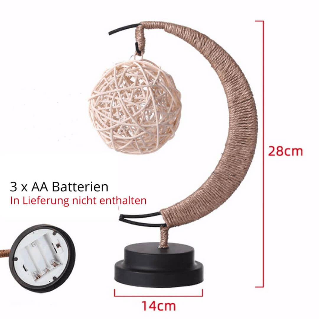 Hol dir ein Stück pure Gemütlichkeit nach Hause mit unserer Rattan-Mondlampe. Der stilvolle Halbmond, sorgfältig mit natürlichem Seil umwickelt, präsentiert eine kunstvoll geflochtene Rattankugel, aus der ein warmes, sanftes Licht strahlt. Diese Lampe ist perfekt, um eine entspannte und einladende Atmosphäre zu schaffen – ideal für gemütliche Leseabende oder als beruhigendes Lichtobjekt in deinem Lieblingsraum. Ein handgefertigter Blickfang, der Natürlichkeit und Wärme vereint.
